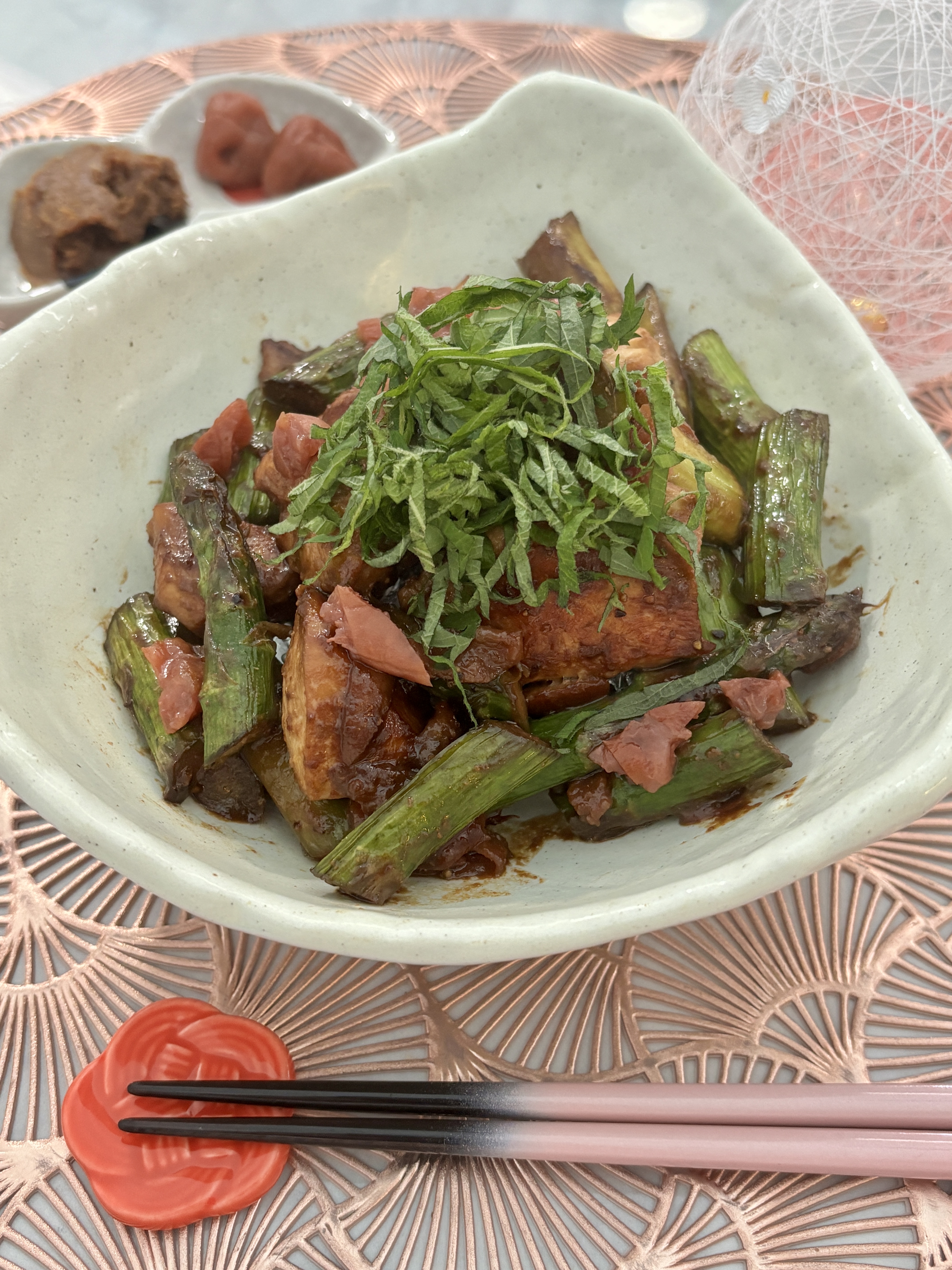 軽くてヘルシー、味わい豊か!春にぴったりの簡単和食、鶏ささみ味噌炒め。アスパラ、梅干し、しそで作る10分レシピです。